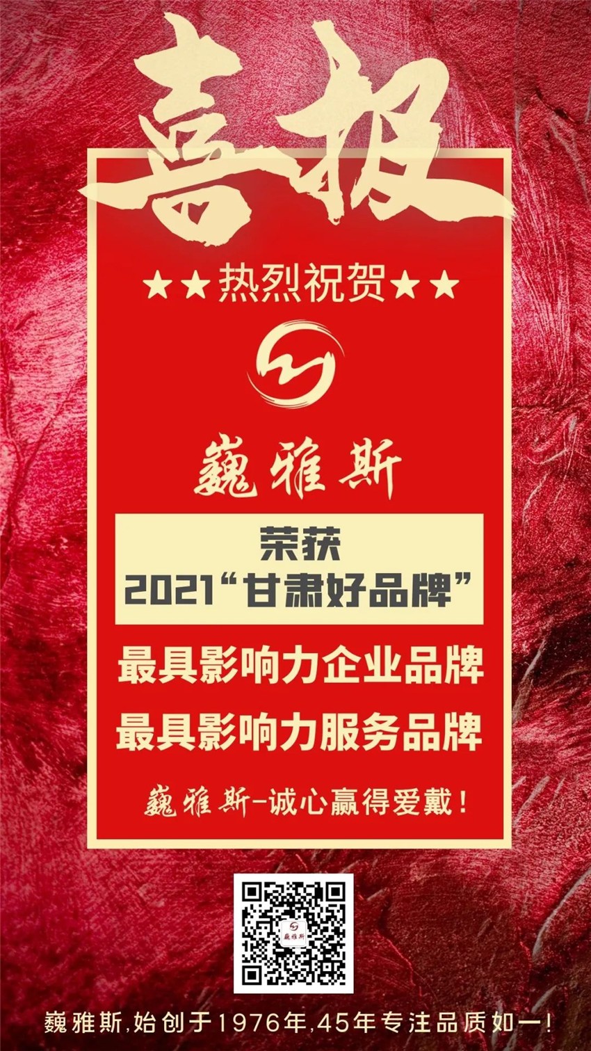 巍雅斯憑借過(guò)硬實(shí)力,在本次活動(dòng)中繼續(xù)被評(píng)為“最具影響力企業(yè)品牌”,同時(shí)也被評(píng)為“最具影響力服務(wù)品牌”。是繼2018年第一屆甘肅好品牌評(píng)為“最具影響力企業(yè)品牌”后,再次獲得甘肅好品牌兩項(xiàng)榮譽(yù)稱號(hào)。