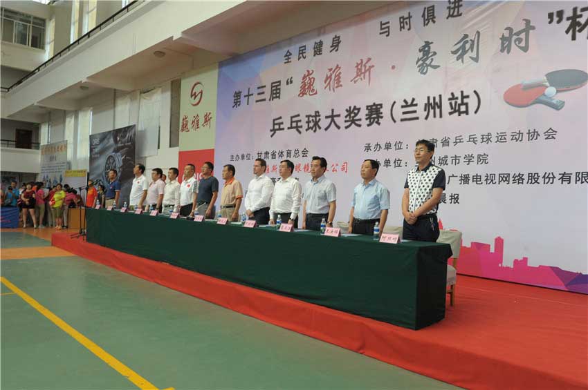 由甘肅省體育總會(huì),巍雅斯名表眼鏡有限公司、瑞士豪利時(shí)表主辦,甘肅省乒乓球協(xié)會(huì)承辦,蘭州城市學(xué)院、甘肅廣播電視網(wǎng)絡(luò)股份有限公司、蘭州晨報(bào)協(xié)辦的全民健身,與時(shí)俱進(jìn)第十三屆“巍雅斯?豪利時(shí)”杯乒乓球大獎(jiǎng)賽(蘭州站),8月17日在蘭州城市學(xué)院培黎校區(qū)體育館正式開幕。來自99個(gè)俱樂部,260支代表隊(duì)的1000多名運(yùn)動(dòng)員,參加所在組別的團(tuán)體和單打比賽,在享受乒乓快樂的同時(shí),向 110多個(gè)獎(jiǎng)項(xiàng)展開激烈角逐,向高達(dá)近8000元的冠軍大獎(jiǎng)發(fā)起沖擊。
