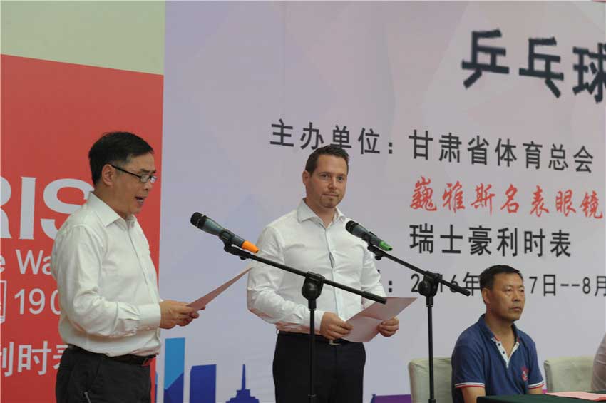 原蘭州軍區(qū)空軍副司令員張瑞勝、中國(guó)鐘表商會(huì)副會(huì)長(zhǎng)、甘肅省眼鏡協(xié)會(huì)會(huì)長(zhǎng)、甘肅省乒乓球運(yùn)動(dòng)協(xié)會(huì)副會(huì)長(zhǎng)、巍雅斯名表眼鏡有限公司董事長(zhǎng)裴正江、巍雅斯名表眼鏡有限公司總裁裴明偉、瑞士豪利時(shí)表大中華區(qū)總裁David Weber先生、甘肅省體育總會(huì)秘書長(zhǎng)石金鐘、瑞士豪利時(shí)表中國(guó)區(qū)總經(jīng)理嚴(yán)明輝、甘肅省乒乓球運(yùn)動(dòng)協(xié)會(huì)會(huì)長(zhǎng)韓力、甘肅省乒乓球運(yùn)動(dòng)協(xié)會(huì)秘書長(zhǎng)宋建農(nóng)及相關(guān)領(lǐng)導(dǎo)等社會(huì)各界人士、運(yùn)動(dòng)員、裁判員、工作人員約一千兩百余人參加了簡(jiǎn)樸但氣氛熱烈的大獎(jiǎng)賽開幕式。